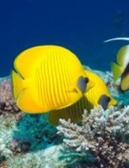 黄色蝴蝶鱼的鱼体是呈金黄色,色彩比较艳丽,在鳃盖上有一处很大的紫色斑纹,非常的抢眼,在体侧上有很多大小不一的横条纹,尾鳍边缘的颜色要比鱼体的颜色要稍微暗一些呈褐色。黄色蝴蝶鱼是一种性格比较温顺的热带海水鱼,饲养的过程中可以与别的鱼一起混养。