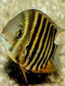 眼大,有黄绿带红的光泽,口小,嘴端有红色斑点,从背鳍末端至尾部有一深色横条纹,竖着与菠萝纹相似,故名菠萝鱼。菠萝鱼的体色多变,随年龄增长而变成浅黄色、古铜色、橄榄绿等,雄鱼较雌鱼色彩更为艳丽。体形大,体长可达18-20cm。